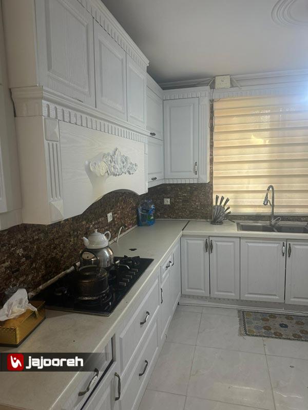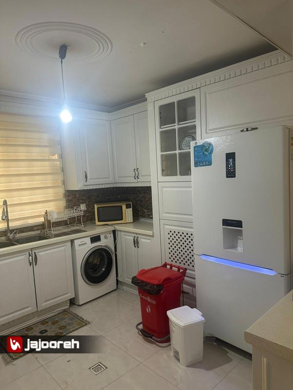 آشپزخانه با تجهیزات کامل ( یخچال و گاز رومیزی و مایکروویو و ماشین لباسشویی و … )، اسپیلت و رادیاتور و شومینه