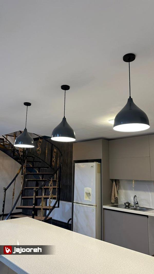 آشپزخانه با امکانات رفاهی شامل اجاق گاز، یخچال، فریزر و لوازم آشپزی