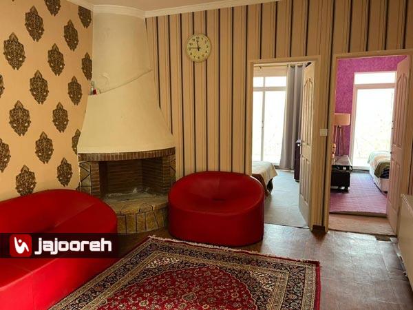 فضای نشیمن به گونهای چیده شده که محیطی دنج برای دورهمی و استراحت شبانه فراهم شود