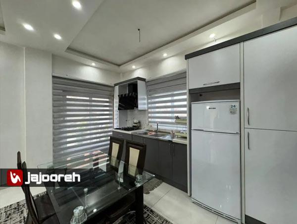 آشپزخانه با امکانات رفاهی شامل اجاق گاز، یخچال، فریزر و لوازم آشپزی